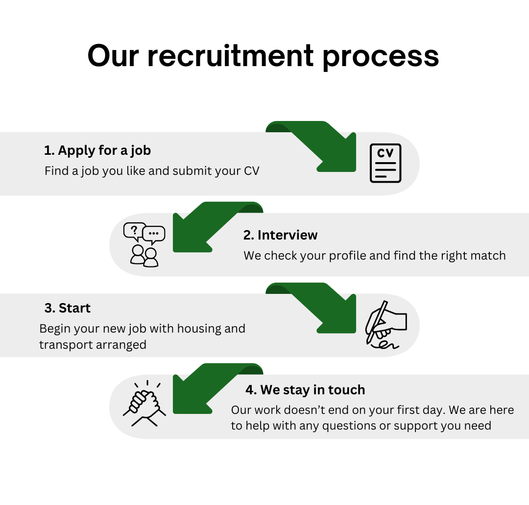 Housing is provided through our reliable partners, always close to your workplace. We make sure your accommodation is comfortable, well-maintained, and ready when you arrive - so you can settle in quickly and focus on your new job.